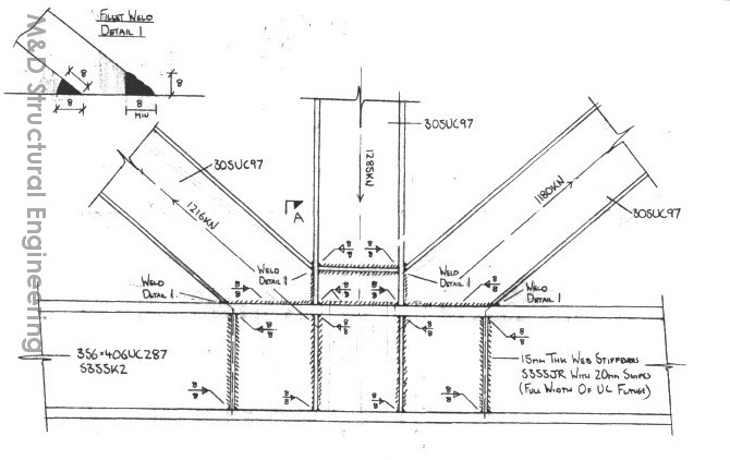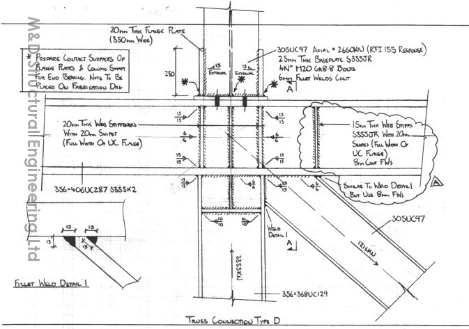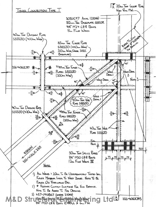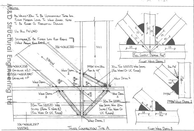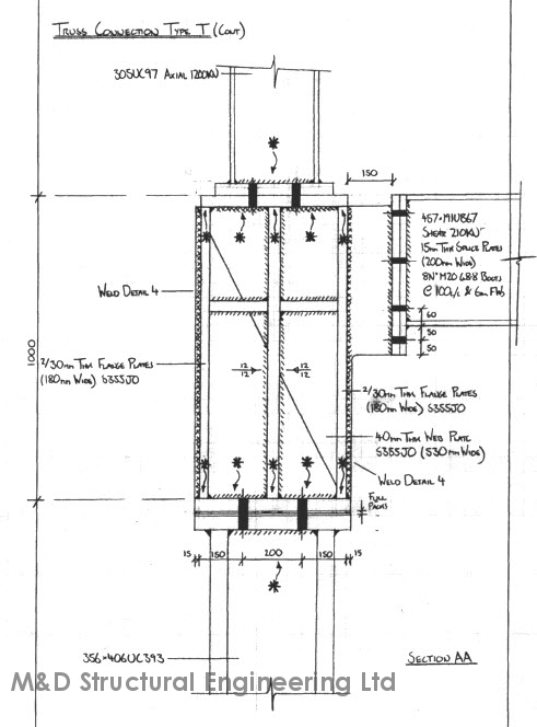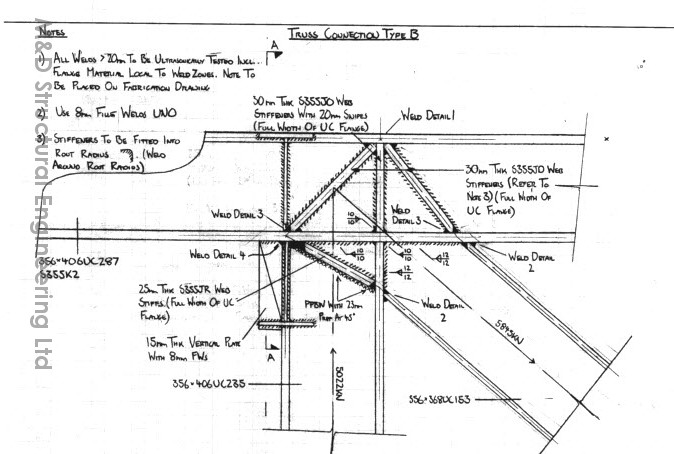 A 25m long x 3.5m high fully welded steelwork truss provides support to main columns to the multi storey car park. Complex fully welded connections were designed to resist axial forces ranging from 110 tonnes to 830 tonnes.